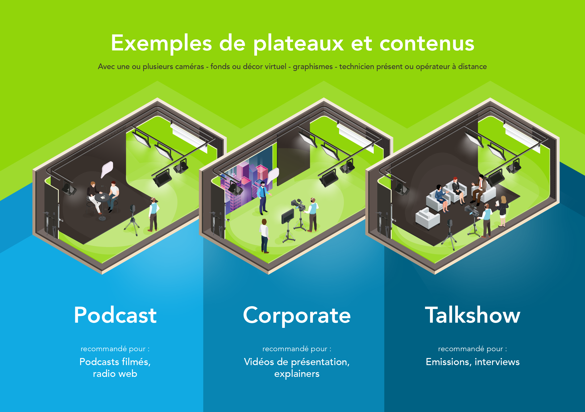 Réalisez podcasts, talkshows, visioconférences, vidéos corporate ou interviews dans un environnement professionnel prêt à l’emploi. Accompagnement technique et humain sur mesure.